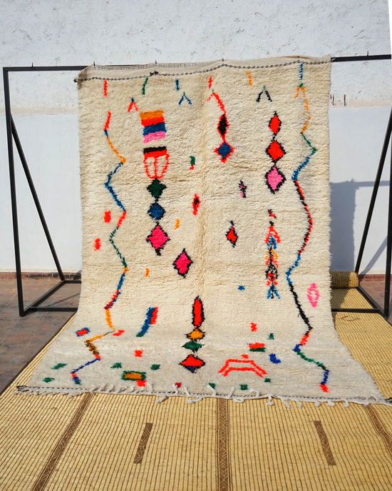 Des montagnes d'Azilal viennent ces tapis vibrants aux couleurs éclatantes. Chaque artisane exprime sa créativité à travers des motifs abstraits uniques, mélangeant tradition et spontanéité. Parfaits pour apporter une touche bohème et artistique à votre espace.