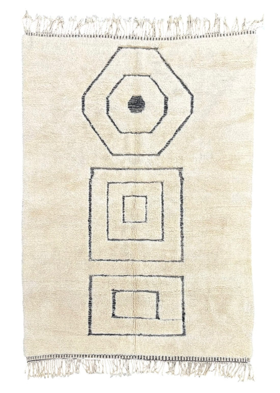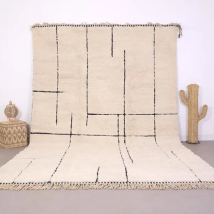 Originaires du Moyen Atlas, les tapis Beni Ouarain sont reconnaissables à leur fond ivoire et leurs motifs géométriques noirs. Tissés avec une laine épaisse et luxueuse, ils apportent douceur et élégance à tout intérieur moderne. Chaque losange raconte une histoire transmise de mère en fille.